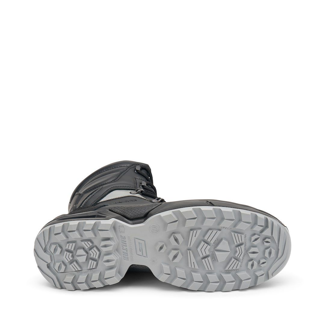 Das Anti-Torsion-System verwendet eine thermoplastische Einlage zur Stabilisierung auf unebenem oder nassem Boden. Im Gegensatz zu starren Lösungen folgt es der natürlichen Fußbewegung und reduziert das Risiko von Umknicken oder Stürzen – ideal für Arbeiten im Freien.
