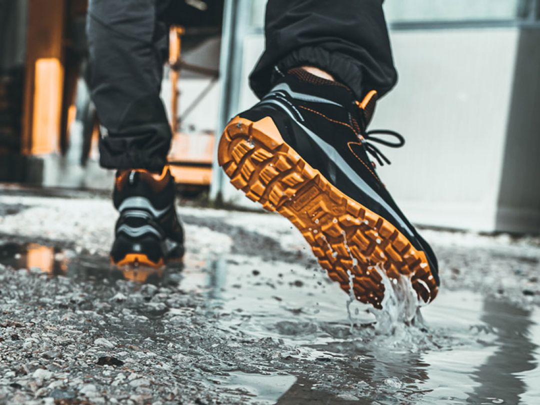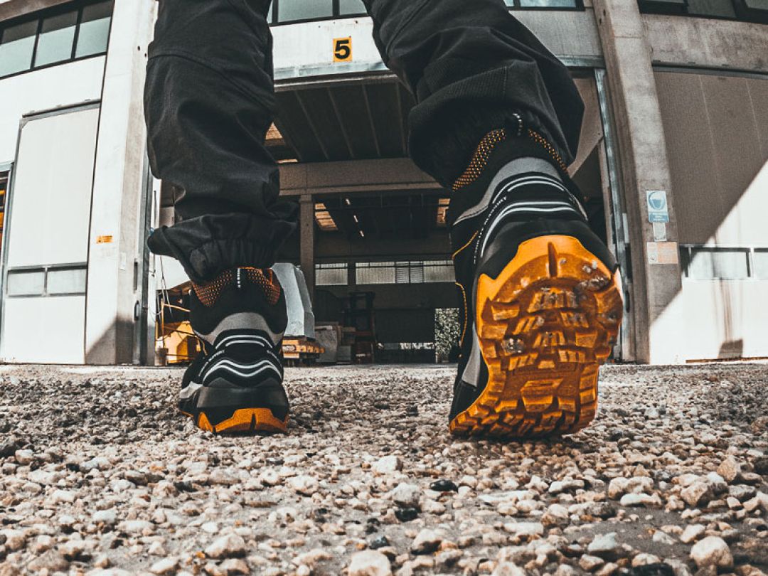 Footwear with energy absorption in the heel to reduce impact while walking. Enhances comfort and protects joints in demanding work environments.