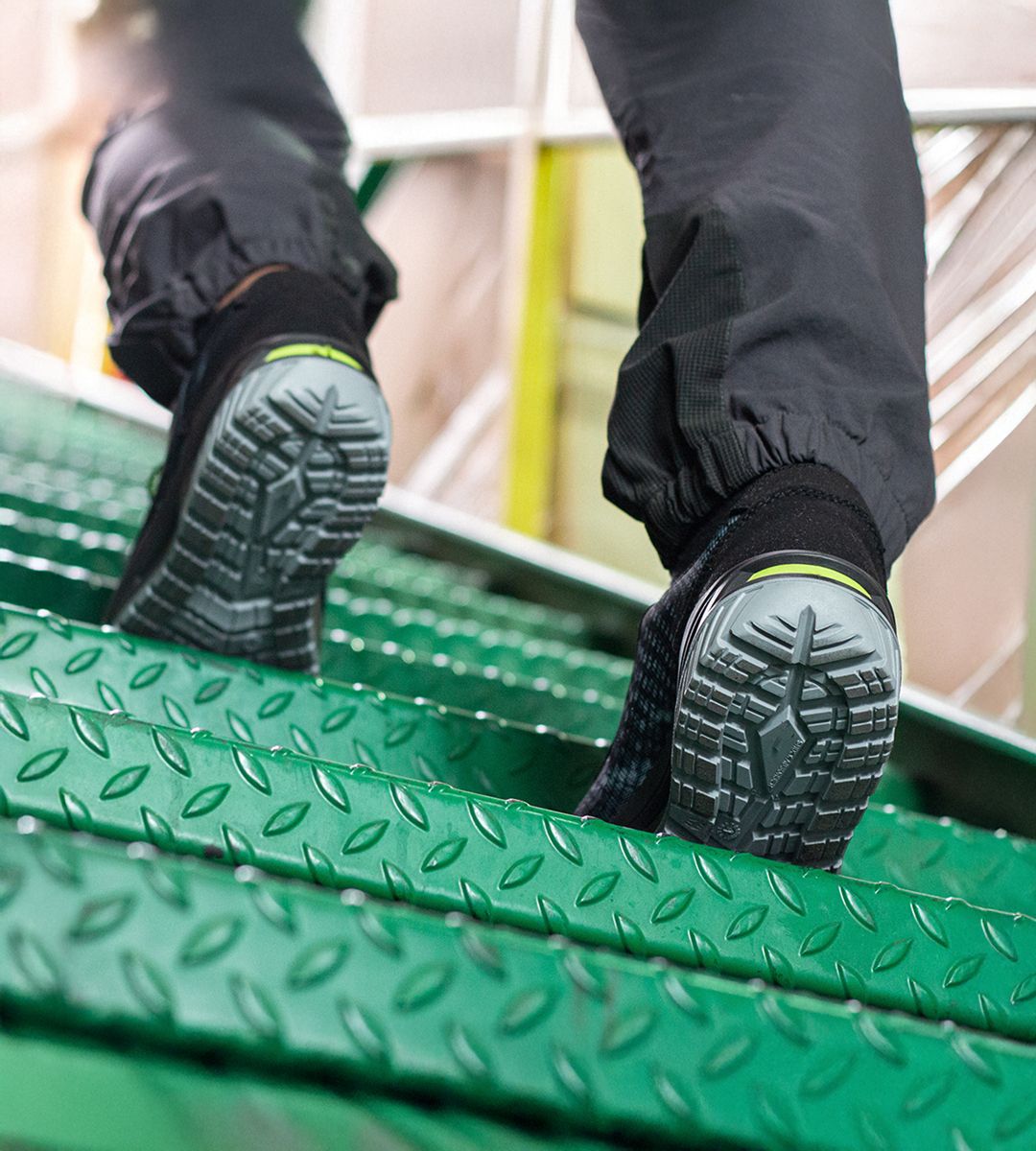 Footwear with energy absorption in the heel to reduce impact while walking. Enhances comfort and protects joints in demanding work environments.