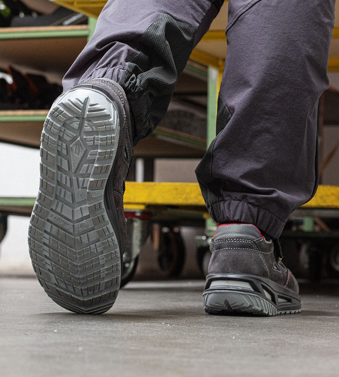Footwear with energy absorption in the heel to reduce impact while walking. Enhances comfort and protects joints in demanding work environments.