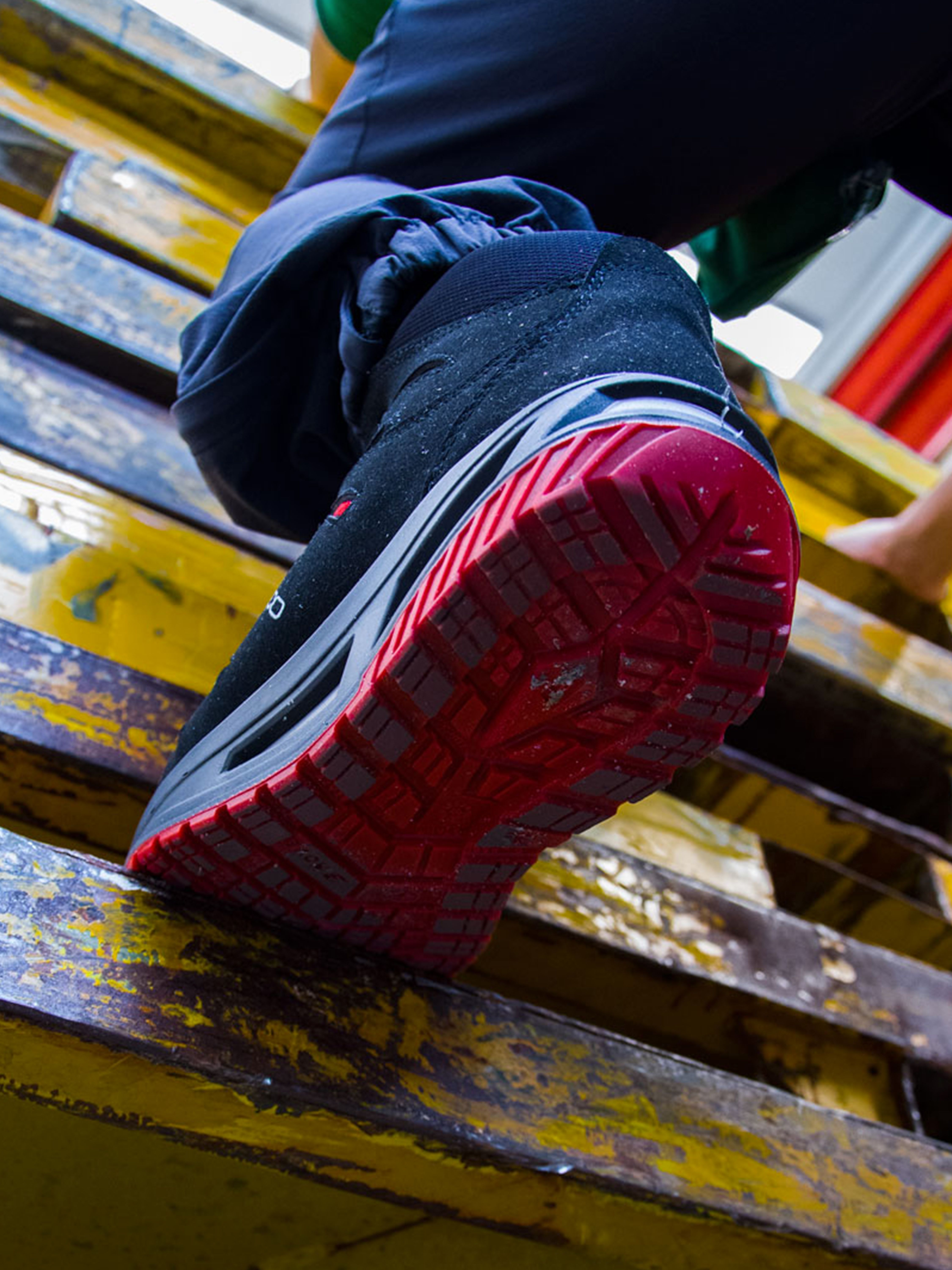 Footwear with energy absorption in the heel to reduce impact while walking. Enhances comfort and protects joints in demanding work environments.