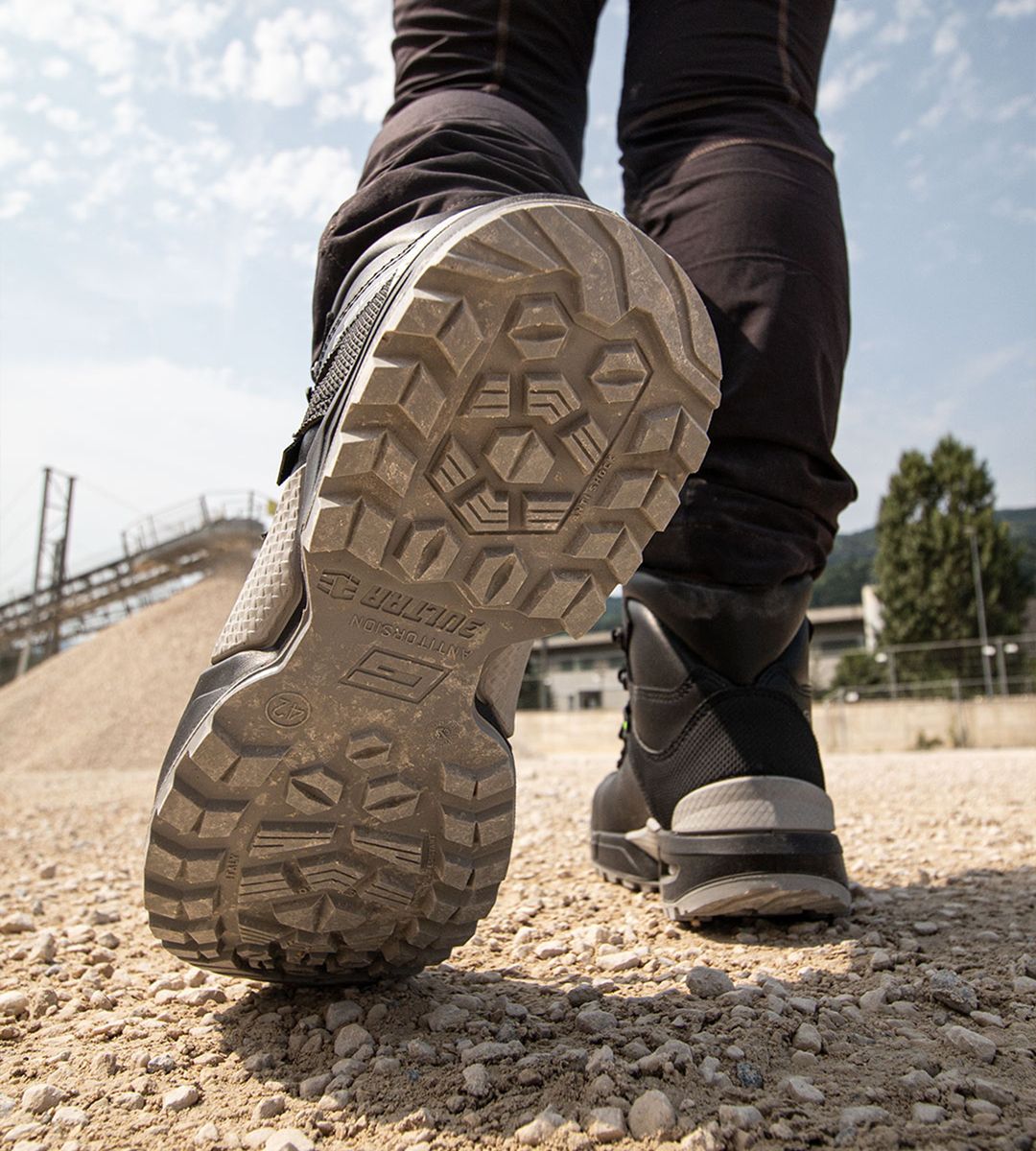 The Anti Torsion system uses a thermoplastic shank designed to increase stability on irregular and wet surfaces. Unlike standard shanks, it flexes with the foot’s natural motion, reducing the risk of twists and falls. Ideal for outdoor work, especially in construction, where surface control is critical.