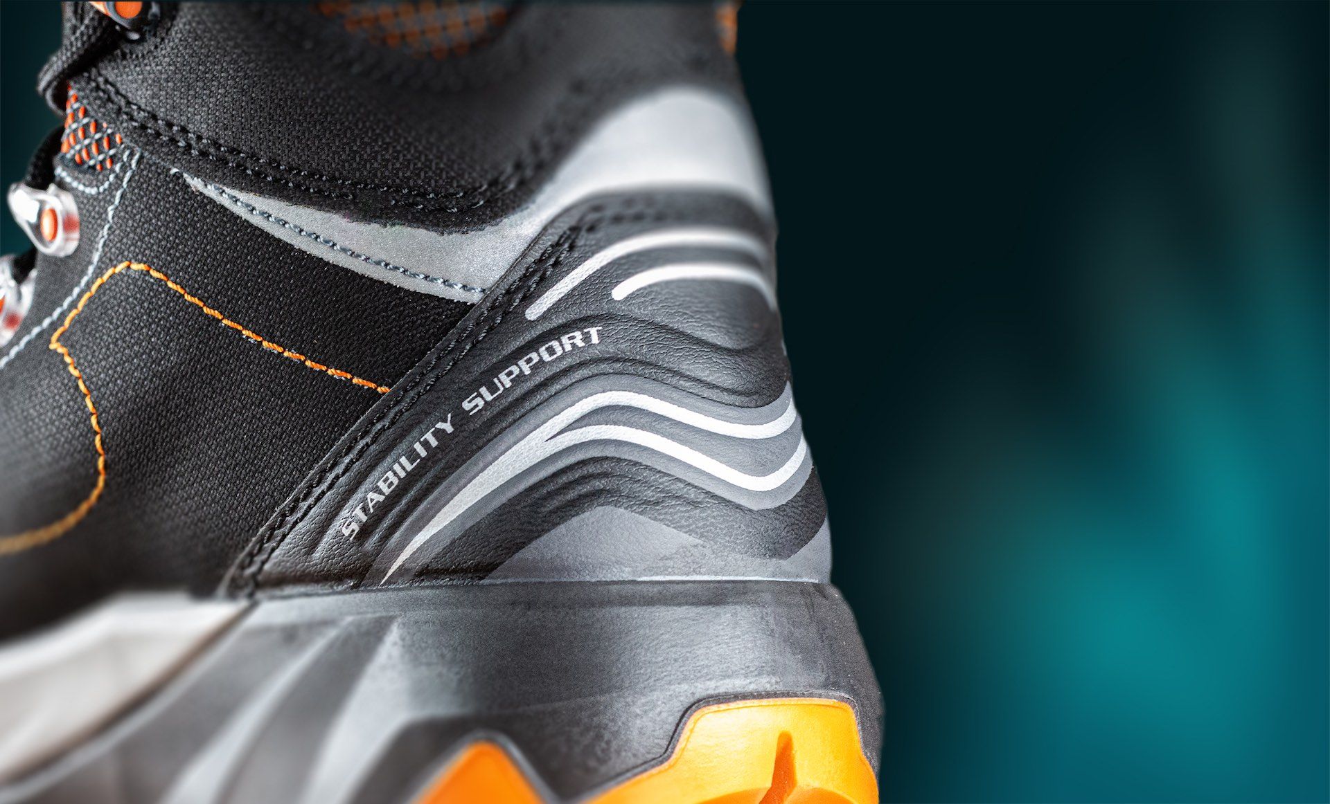 Stability Support maintient le pied plus stable à l'intérieur de la chaussure, réduisant les frottements internes du talon contre la tige. Cela améliore le confort quotidien et réduit également l'usure de la chaussure, prolongeant sa durée de vie même dans des conditions de travail intenses.
