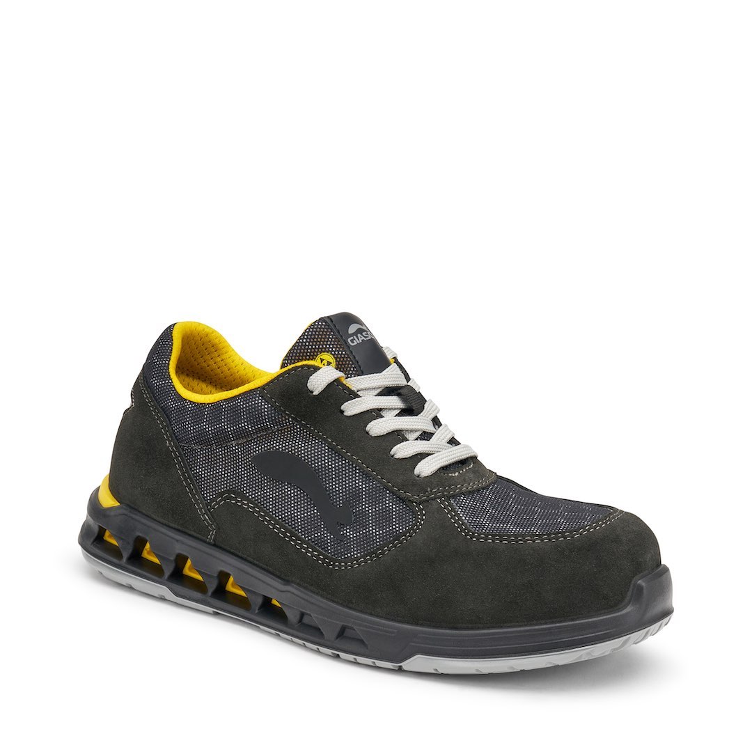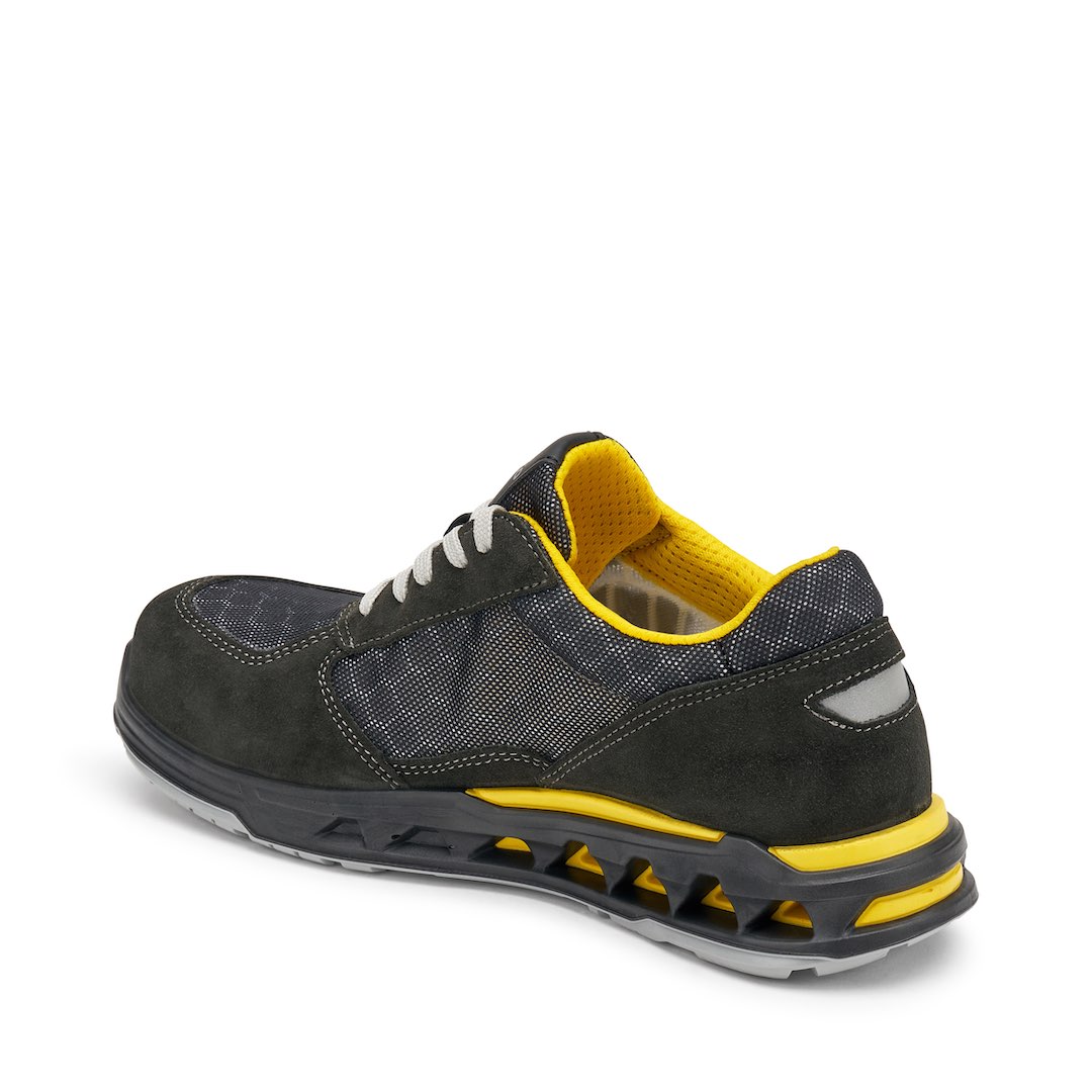 Scarpa antinfortunistica bassa, in pelle groppone scamosciato spessore 1,8-2,0 mm., e tessuto tecnico traspirante e resistente all' abrasione.