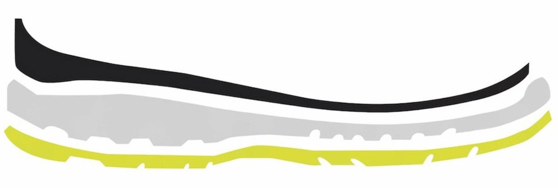 Strato centrale con densità più soffice per garantire comfort a ogni passo. La memoria di forma del poliuretano rende la scarpa più duratura e previene posture scorrette.
